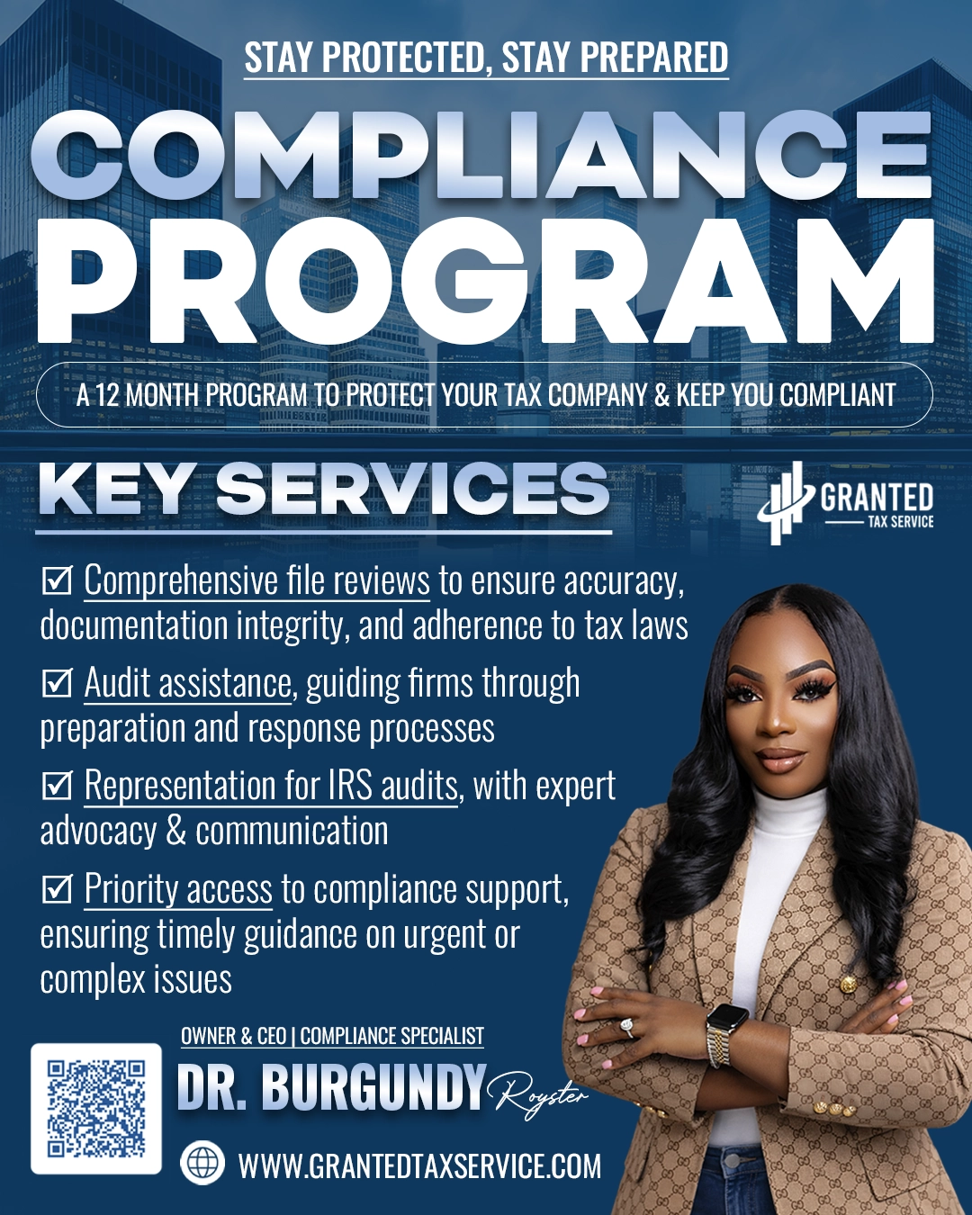 The Granted Tax Service Compliance Program is designed to support tax preparation companies in maintaining accurate, ethical, and fully compliant operations. The program provides dedicated, professional compliance assistance to help firms meet regulatory standards and reduce audit risk.